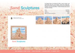 Today the Minister for the Cabinet Office, the Hon. Wayne Furbert said, “The Philatelic Bureau of the Bermuda Post Office is very pleased to present a new commemorative stamp issue, ‘Sand Sculptures’. Ms. Emmerson has turned a fun activity into an art form, one which has been particularly appreciated during this time of social restrictions resulting from the pandemic.